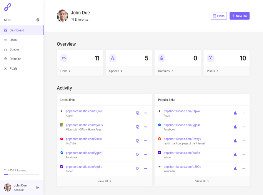 DASHBOARD – Get the account overview at a glance. Quickly manage your latest or most popular Links.