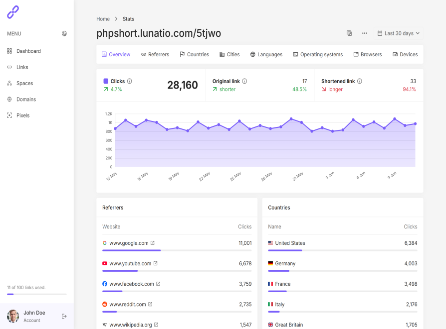 STATS – Get analytics insights for your links about your audience Overview, Referrers, Countries, Cities, Languages, Platforms, Browsers, and Devices.